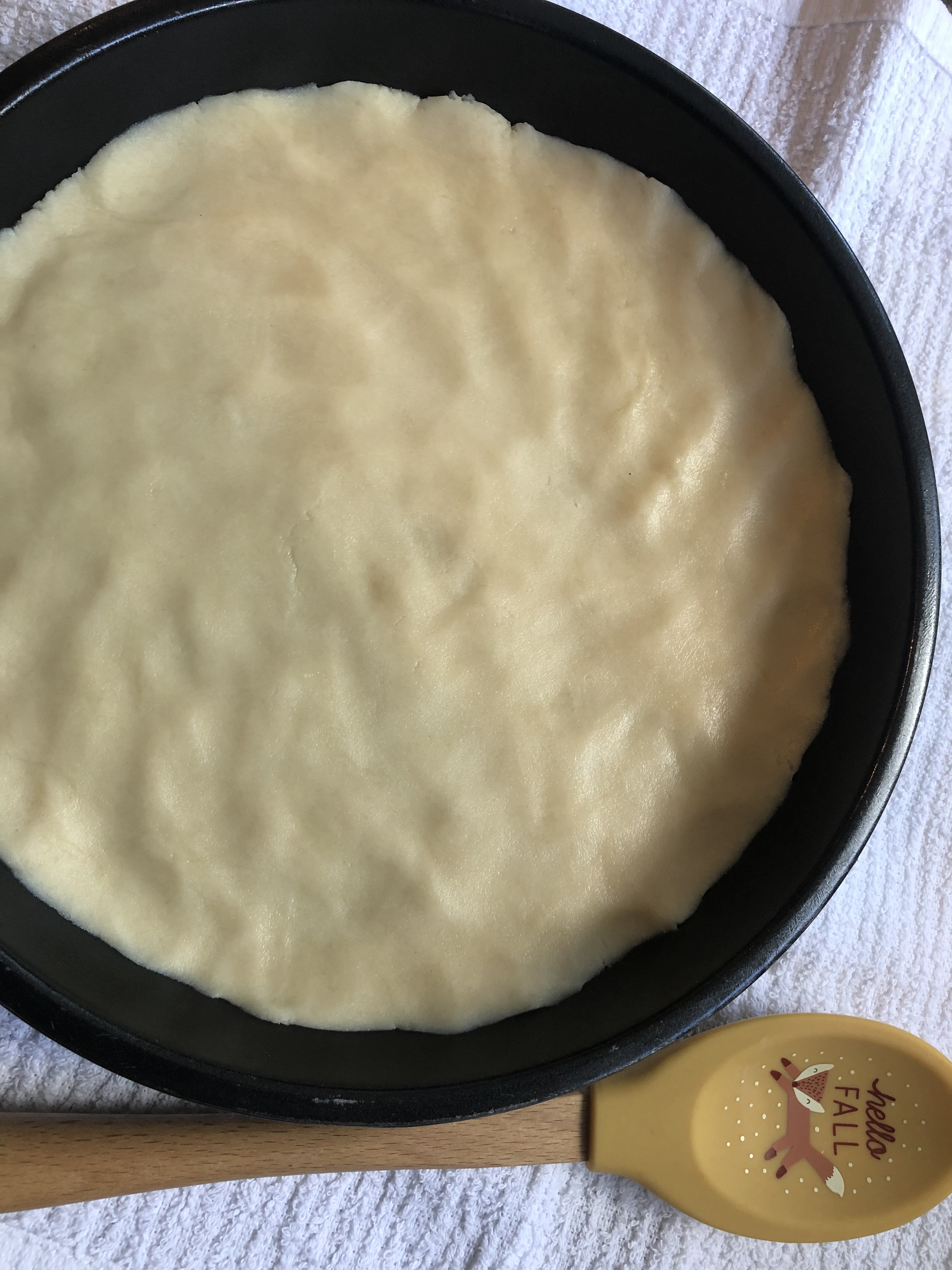 3) Spray pan (9″ round or larger) and place crust mixture just mixture together in. Spread evenly all the way to the edge of the pan.