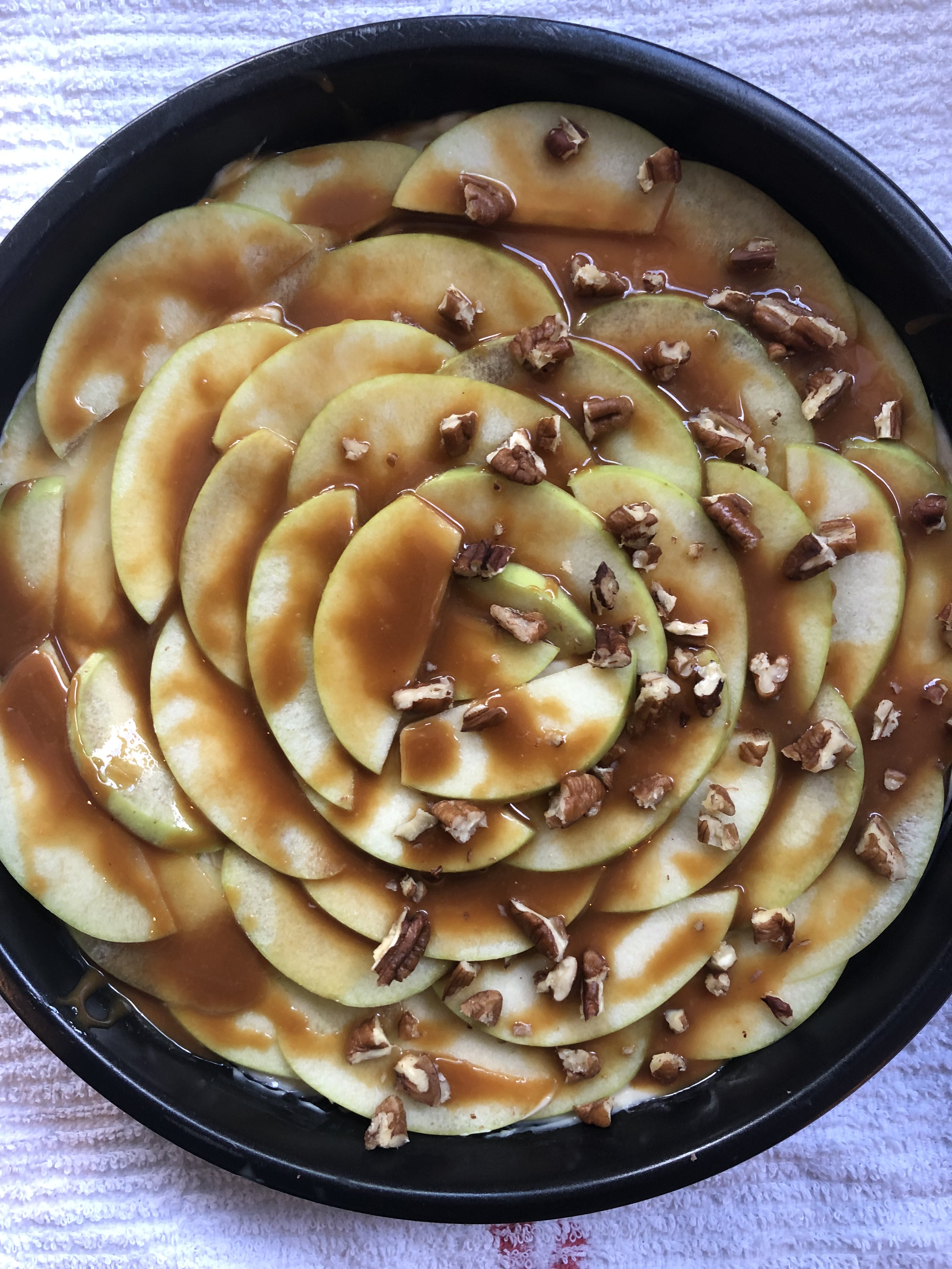 11) Heat a couple tablespoons of the caramel topping in a small bowl and use a spoon or fork to slowly drizzle caramel over apple layer.