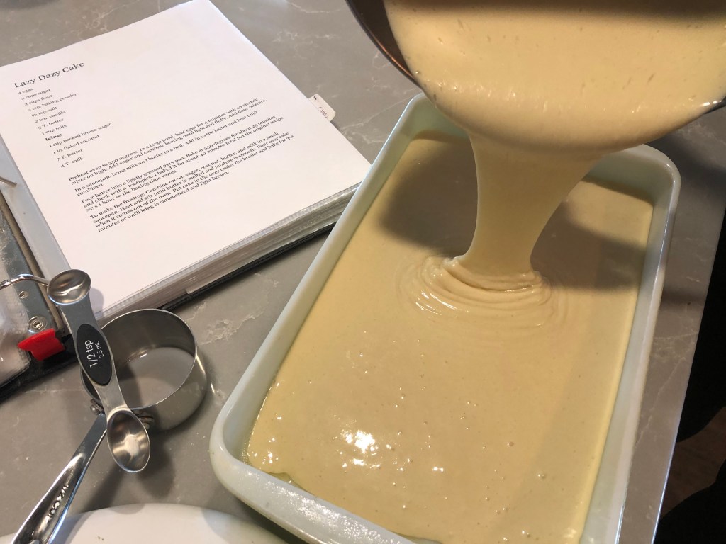7) Pour batter into the 9×13 pan and bake at 350 degrees for approximately 40 minutes, checking occasionally by poking with a toothpick until it comes out clean.