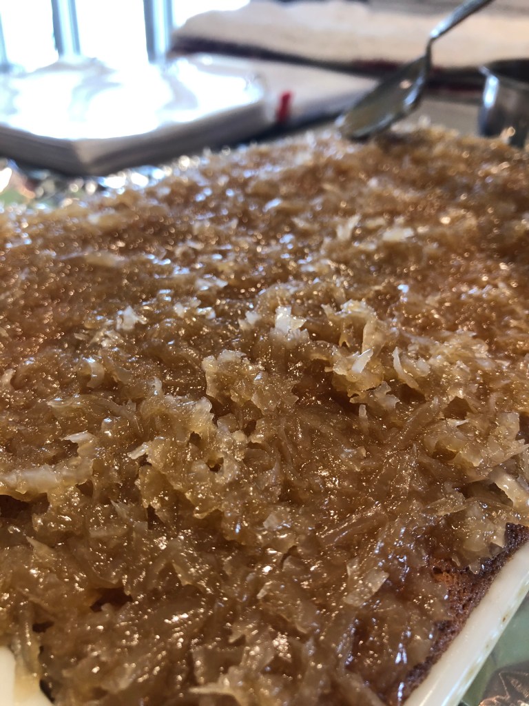 This week’s post is for my dad since he’s the man of the hour who celebrated his birthday earlier this week. Me posting this recipe is a true testament to how loved he is because that love had to outdo my extreme dislike for the star ingredient of this cake…coconut. Don’t get me wrong here, I want to love coconut..I really do! But there is just something about the texture that rubs me the wrong way when a dish has too much coconut. Girl Scout caramel delight cookies with a sprinkling of coconut on top? Put me down for a couple boxes! Perfectly delicious cake with a heaping layer of coconut glaze on top? Can’t handle it even as bad as I want to. I always thought I would outgrow this but, unfortunately, my taste buds have not succeeded thus far. I have many genetic traits that I can thank my dad for but he apparently chose to skip the coconut-loving-gene when I came around. Hopefully genetics was kinder to you and the picture makes your taste buds water for some sweet satisfaction!