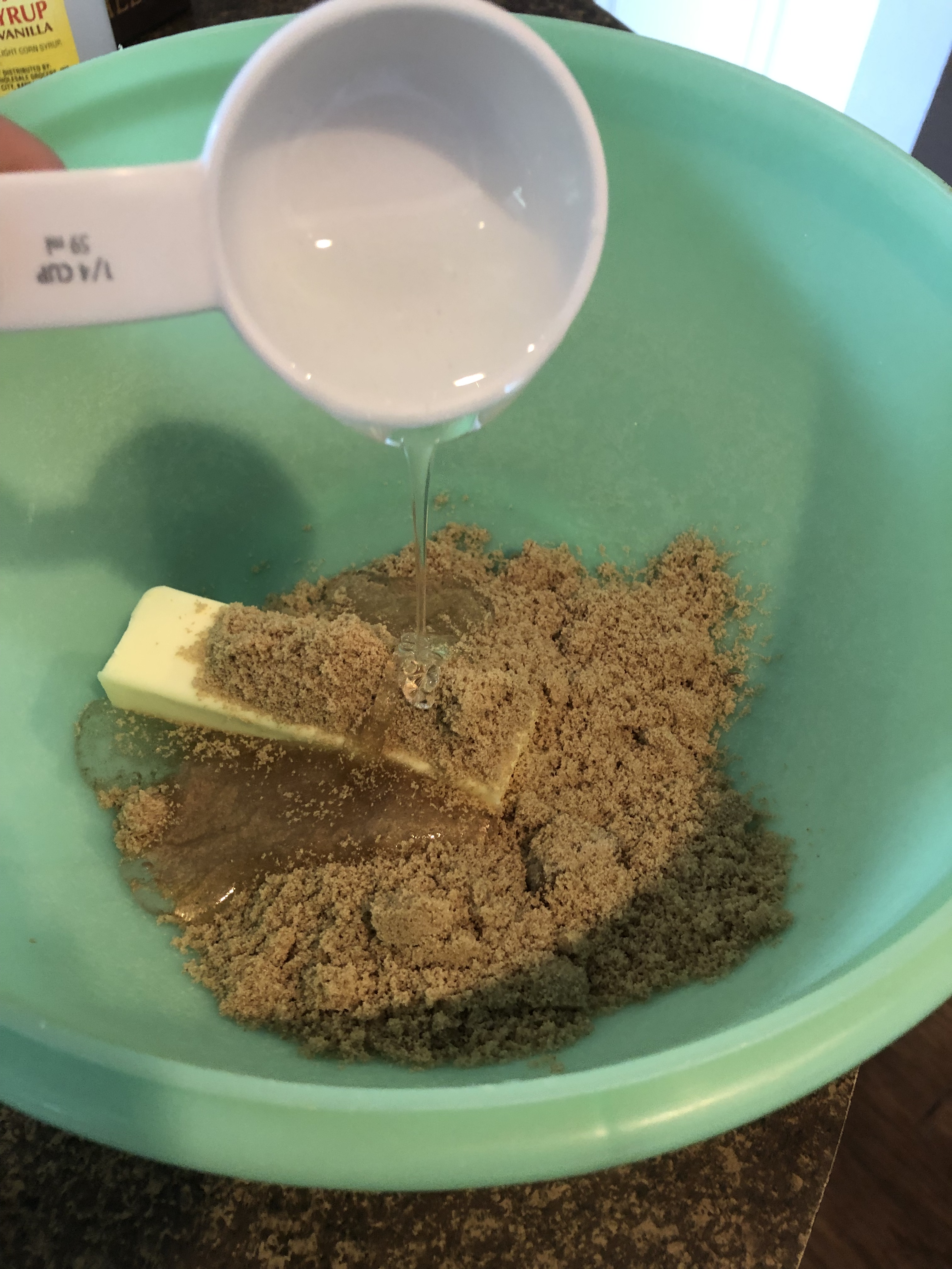 2) In microwaveable bowl combine the stick of butter, brown sugar, and light corn syrup. Microwave 90 seconds or until you see it start to boil.