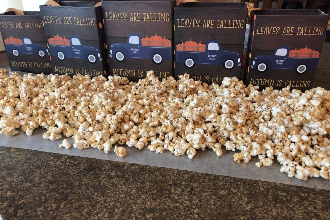 Found these adorable boxes and filled them up to share the caramel goodness with some friends and family! Homemade caramel popcorn is a great gift any time but especially nice as we head into the Fall and football game season!