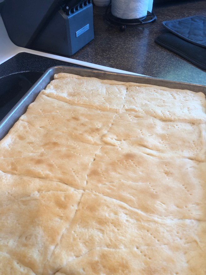 1) Spray large pan or cookie sheet and roll out crescent rolls so it’s a sheet of dough ( flat and even with seals pinched closed).