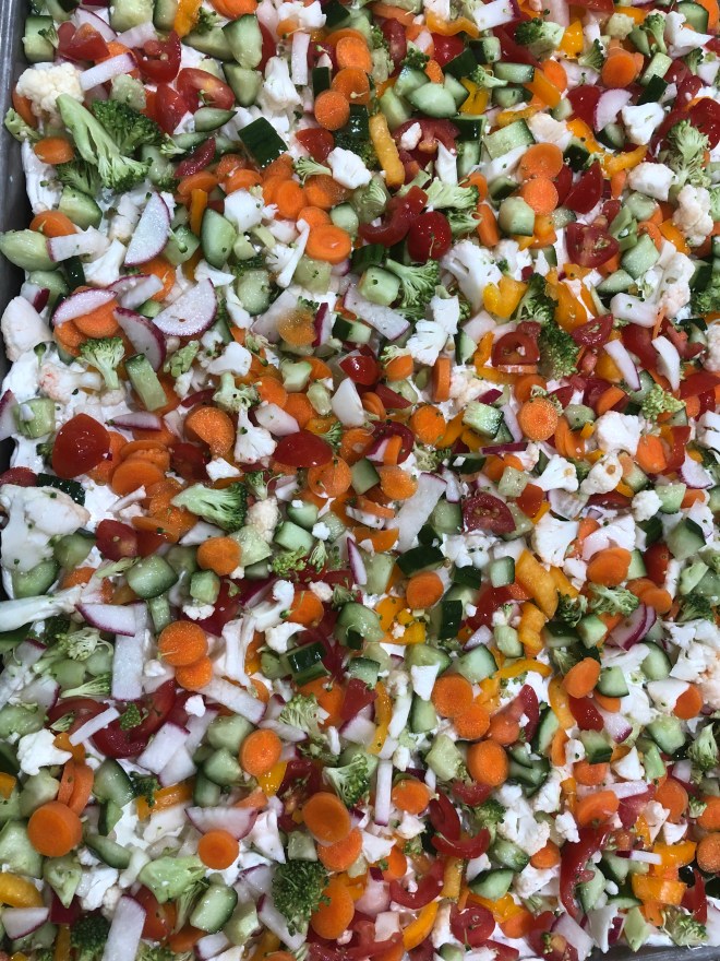 -4 cups total assorted chopped veggies (cucumbers, tomatoes, carrots, broccoli, cauliflower, bell peppers, radishes, black olives)