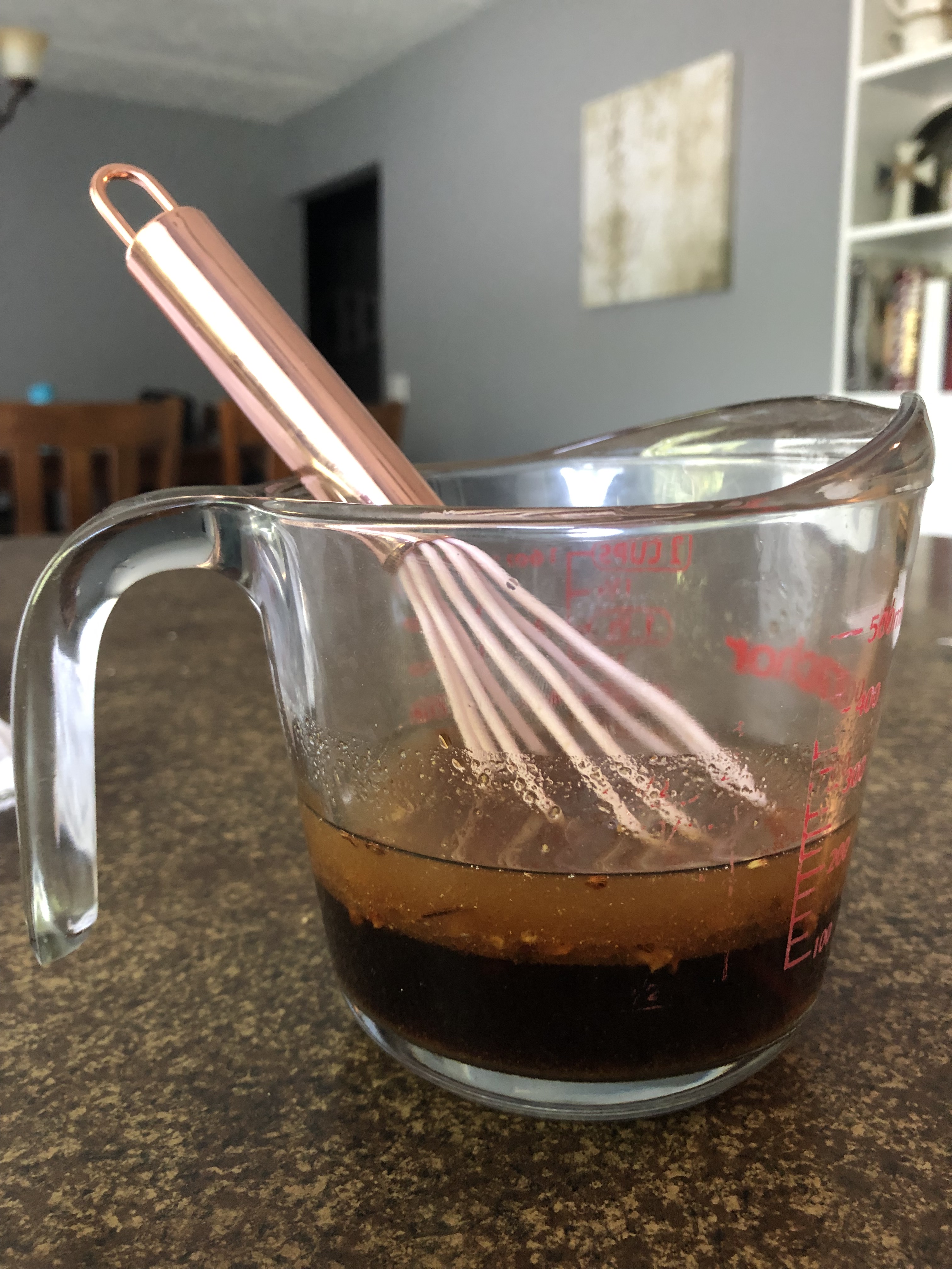 - Measure vegetable oil, apple cider vinegar, sugar, salt, pepper, and garlic into small saucepan and bring to a boil over medium high heat, stirring occasionally. Set aside and let cool.