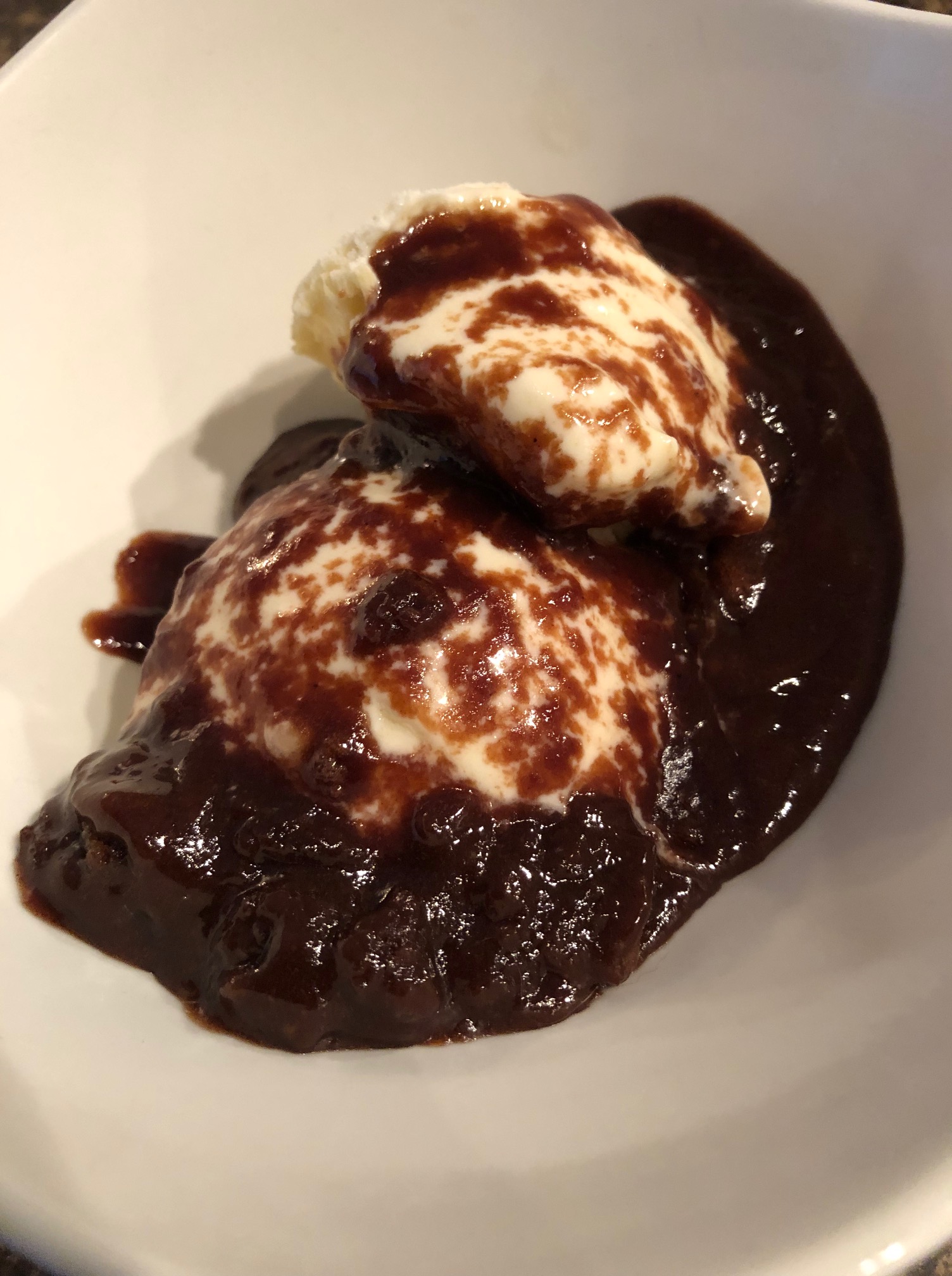 - Place pan into preheated (325 degree) oven and bake for approximately 15 minutes. ***IMPORTANT: turn the oven light on/watch/check frequently after it’s been in the oven around 10 minutes as you should only bake this until the edges of the pan sets into a brownie-like consistency (about an inch and a half from the edge towards the middle should be like this) and the remainder (middle) of the pan is hot fudge consistency!***